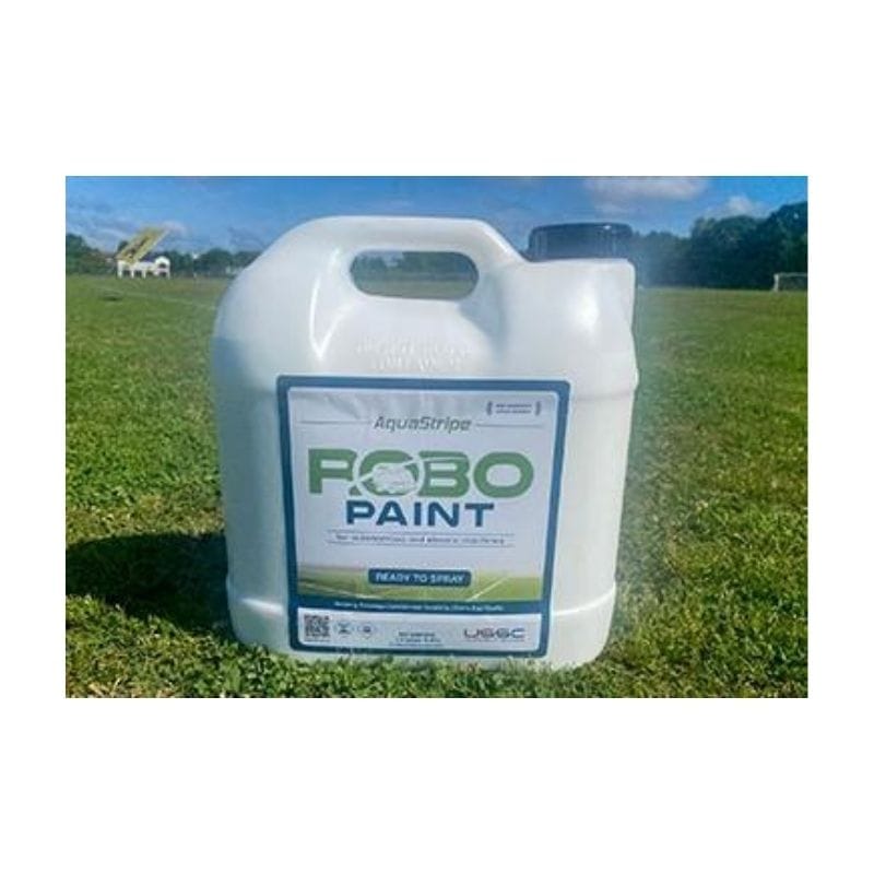 2.5-gallon jugs of RTS paint that will fit in the field marking ROBOTS. READY TO SPRAY RTS, just SHAKE or use Jiffy mixer–drill to lightly mix and SPRAY. BRIGHT DURABLE PAINT that will NOT CLOG.Proprietary formula designed to go through the smallest conical nozzles with low consumption, RoboPAINT. Spray will yield SHARP, DURABLE, STAND-OUT athletic field lines and logos.