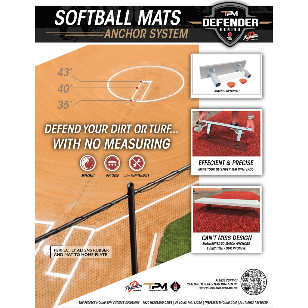 The Perfect Mound Defender Series Softball Mat protects your play surface by eliminating the holes dug out by continued use while also providing a flat surface for the pitcher’s stride leg to land.