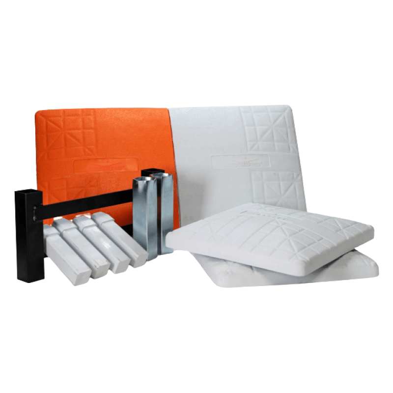 Rogers Pro-Style Flexy-Base set with double first base. Constructed of 100% durable white and orange rubber. Underside beehive design allows the base to compress upon impact reducing sliding injuries while providing stability and support during regular play. Pebble-embossed, UV-resistant base top helps to prevent slipping. Ground anchors, rubber stanchions, and base plugs are included.