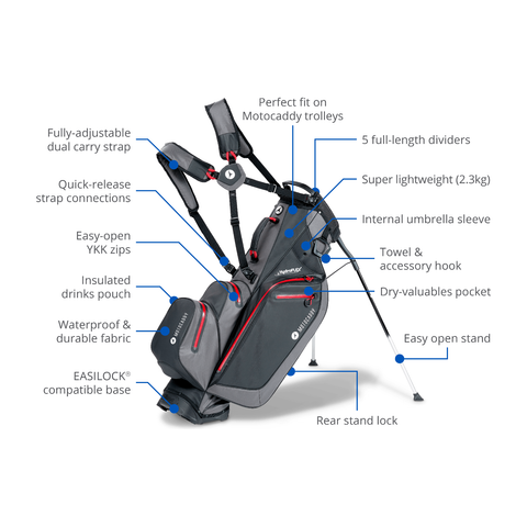 Offering unparalleled versatility, the HydroFLEX's innovative hybrid design means it excels both as a stand bag and as a cart bag. With EASILOCK® technology, quick-release carry straps, a unique integrated stand design, and an adjustable rear stand-lock, it instantly transforms to fit securely onto any Motocaddy trolley.