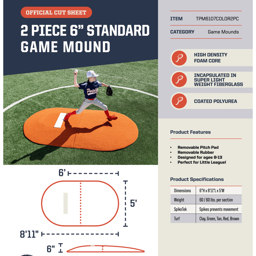 Dynamic Tournament Play with Added Mobility The 6” Two-Piece Portolite Mound is tailored for tournament play, featuring the same gentle slopes and stability as the standard version, but with enhanced portability. Perfect for Little League and players under 13, this mound is easy to transport and set up, making it an ideal choice for teams traveling to various tournaments.
