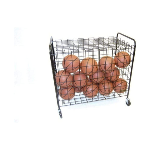 The full-size locker holds 28-30 balls. Heavy steel wire mesh. Powder-coated for durability. Hinged lid can be locked. 4 HD swivel caster wheels. Size: 42"L x 24"W x 38.5"H